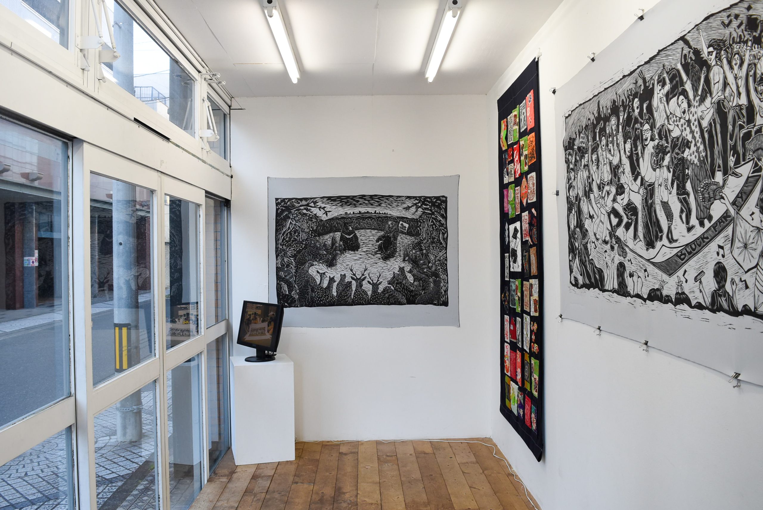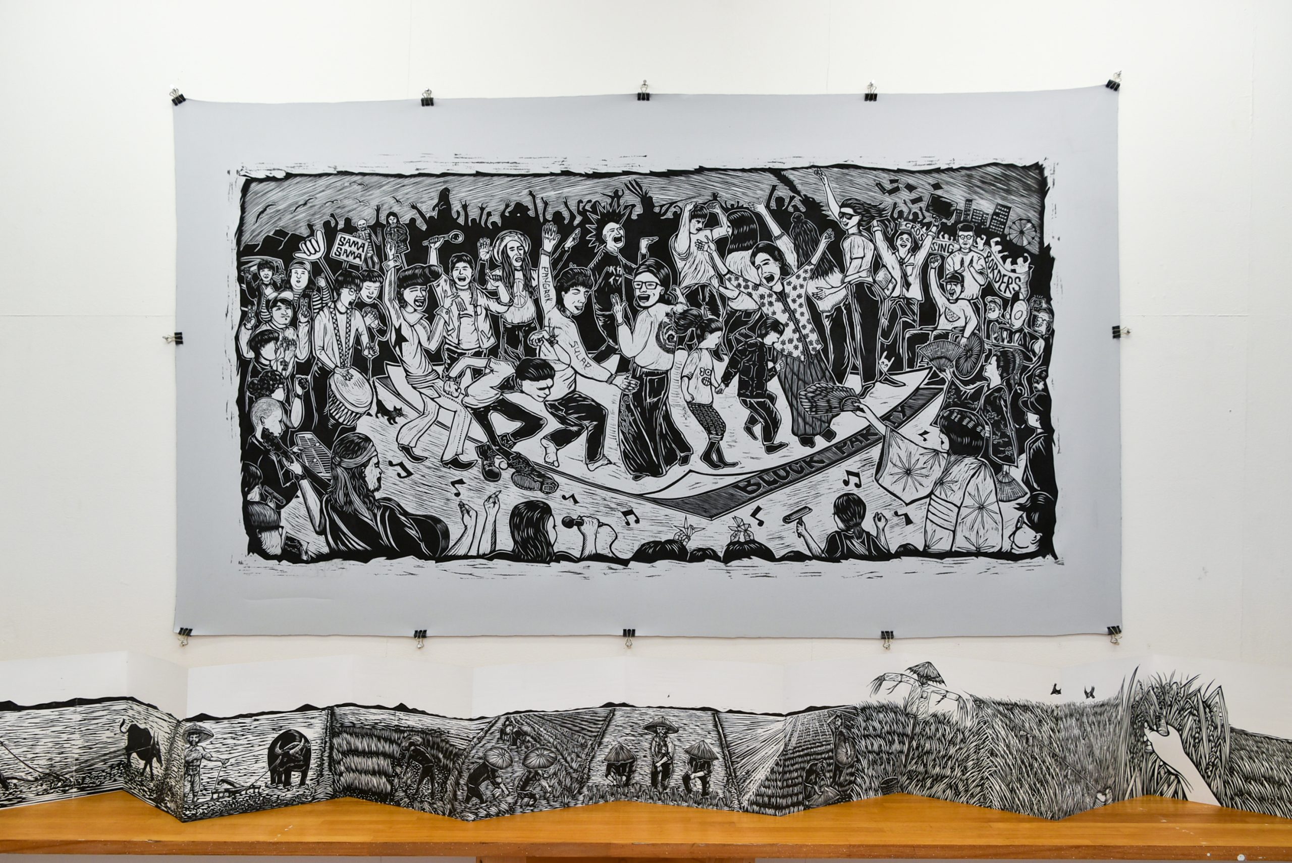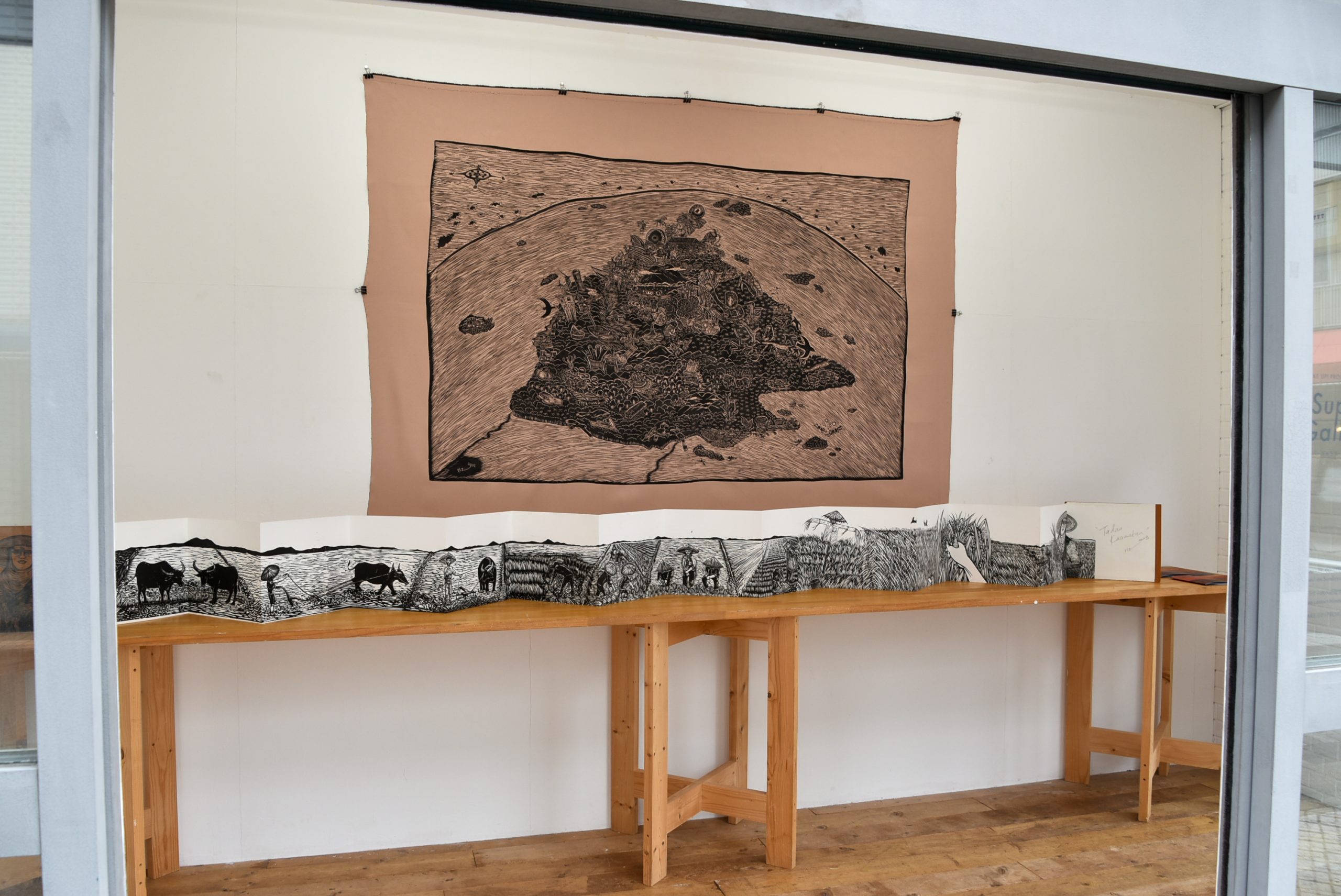 スーパーギャラリーではボルネオ島のサバ州を描いた大型の木版画作品や、木版画によるアートブックなどの作品を展示しています。