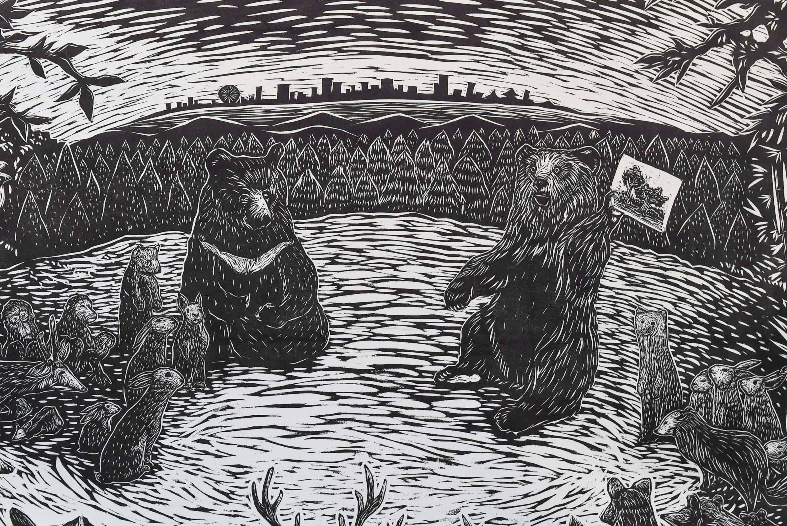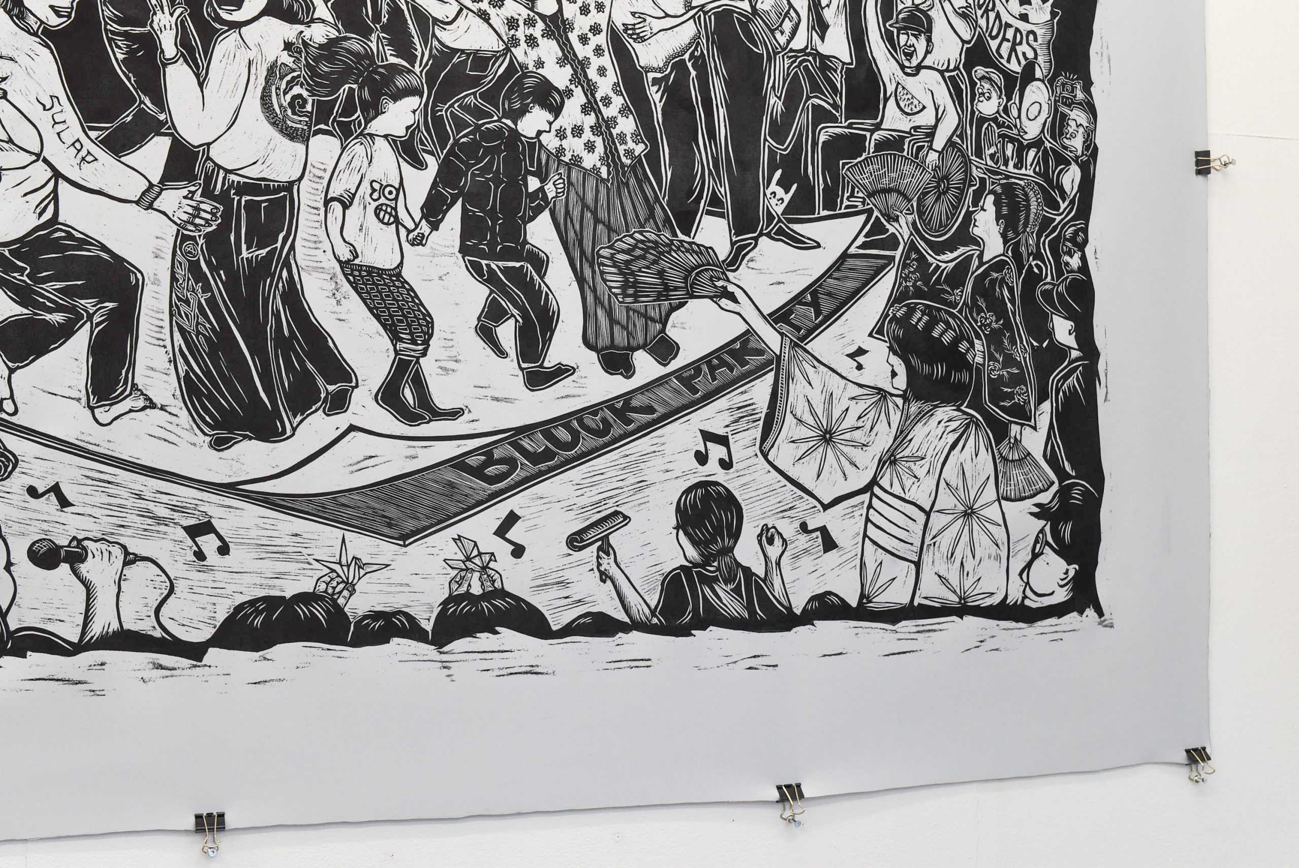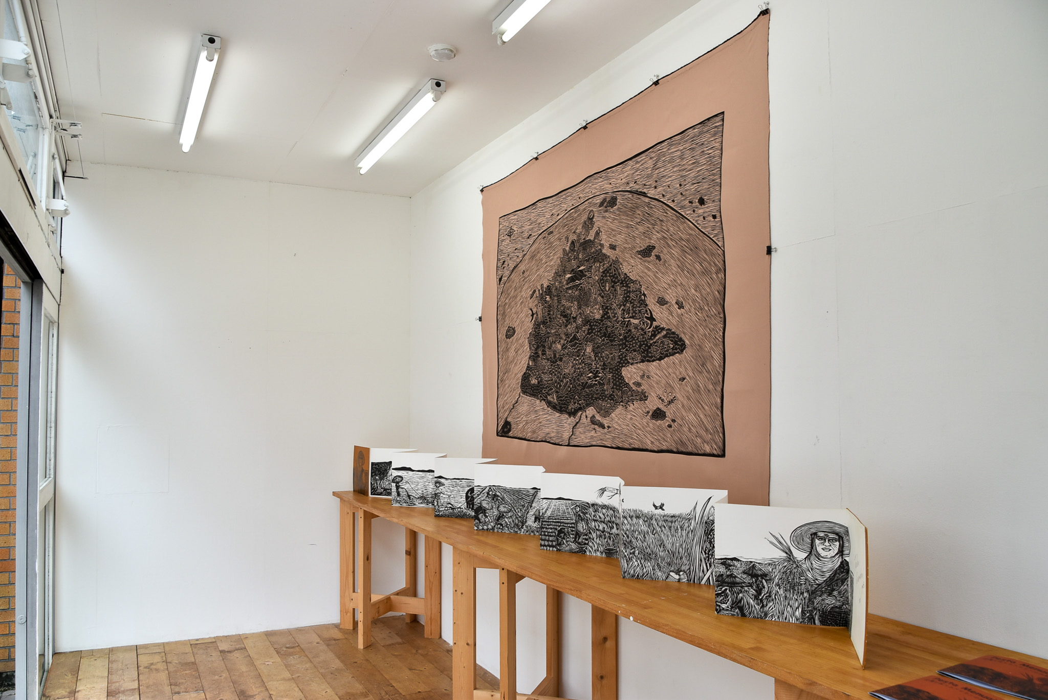 スーパーギャラリーではボルネオ島のサバ州を描いた大型の木版画作品や、木版画によるアートブックなどの作品を展示しています。