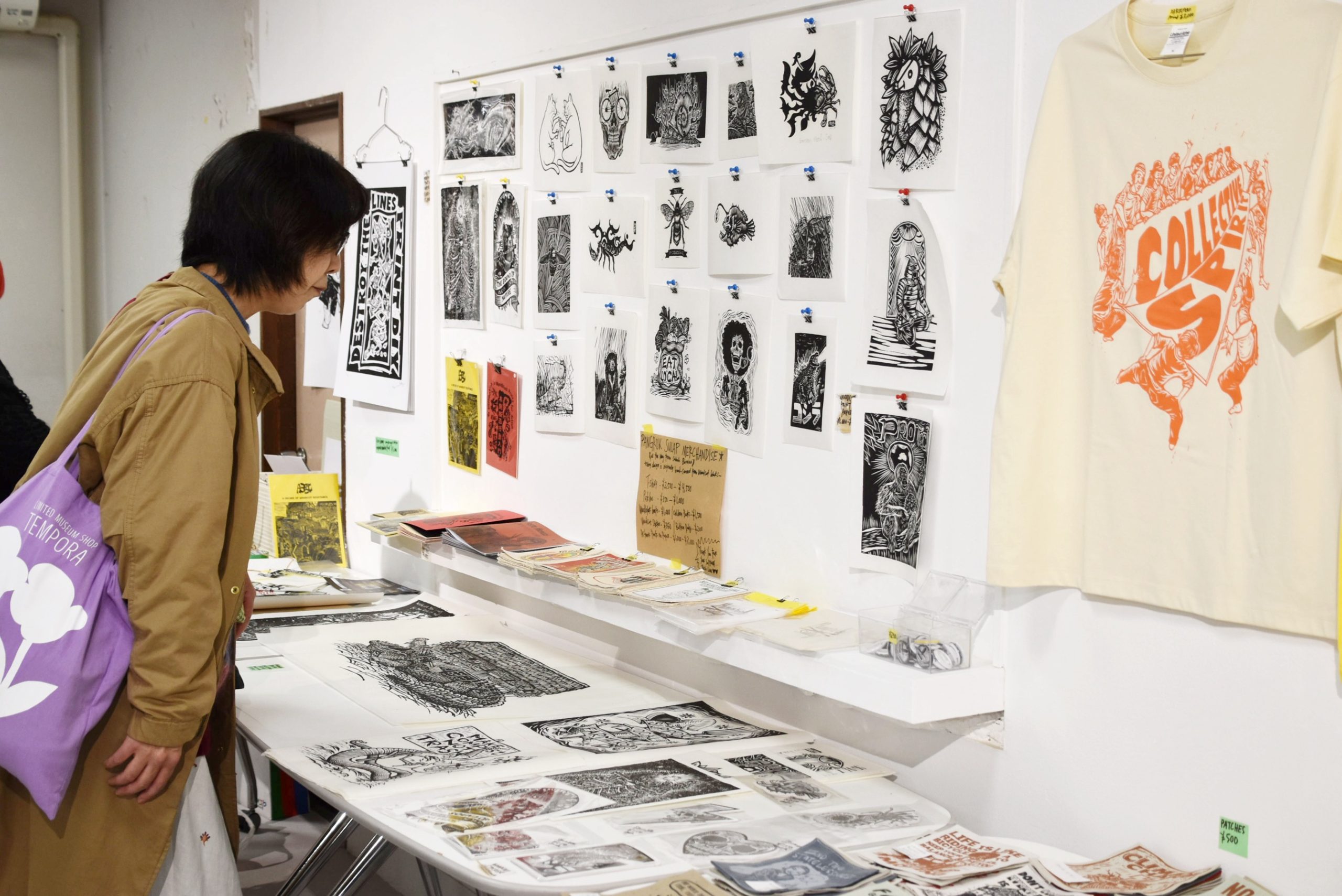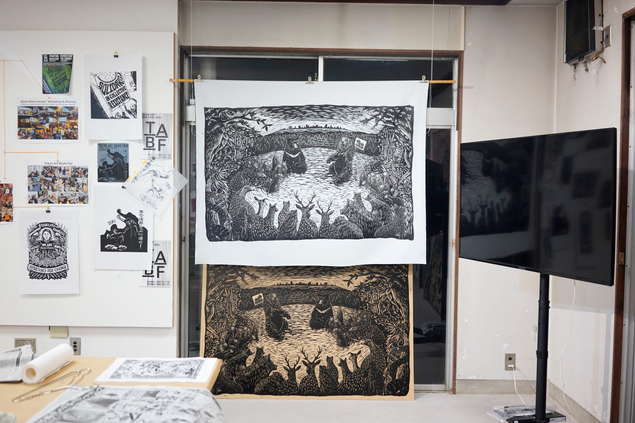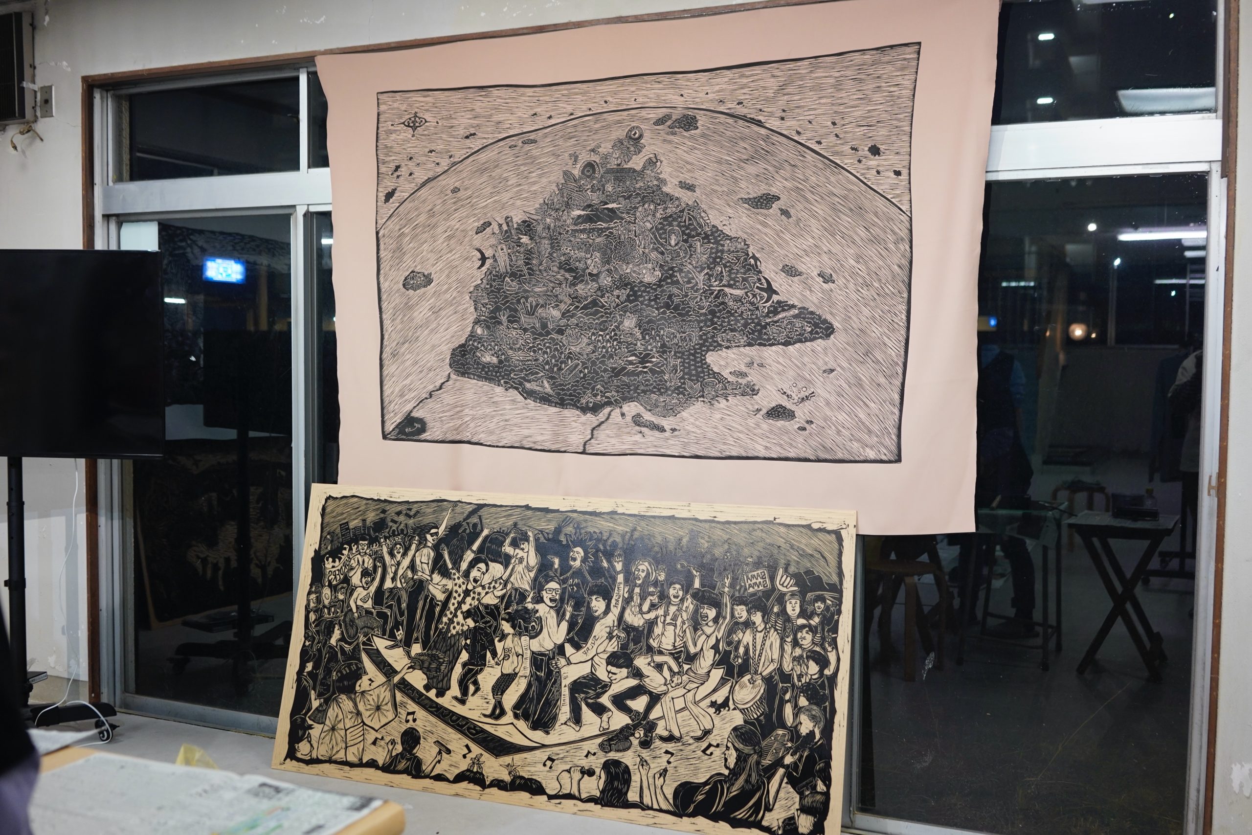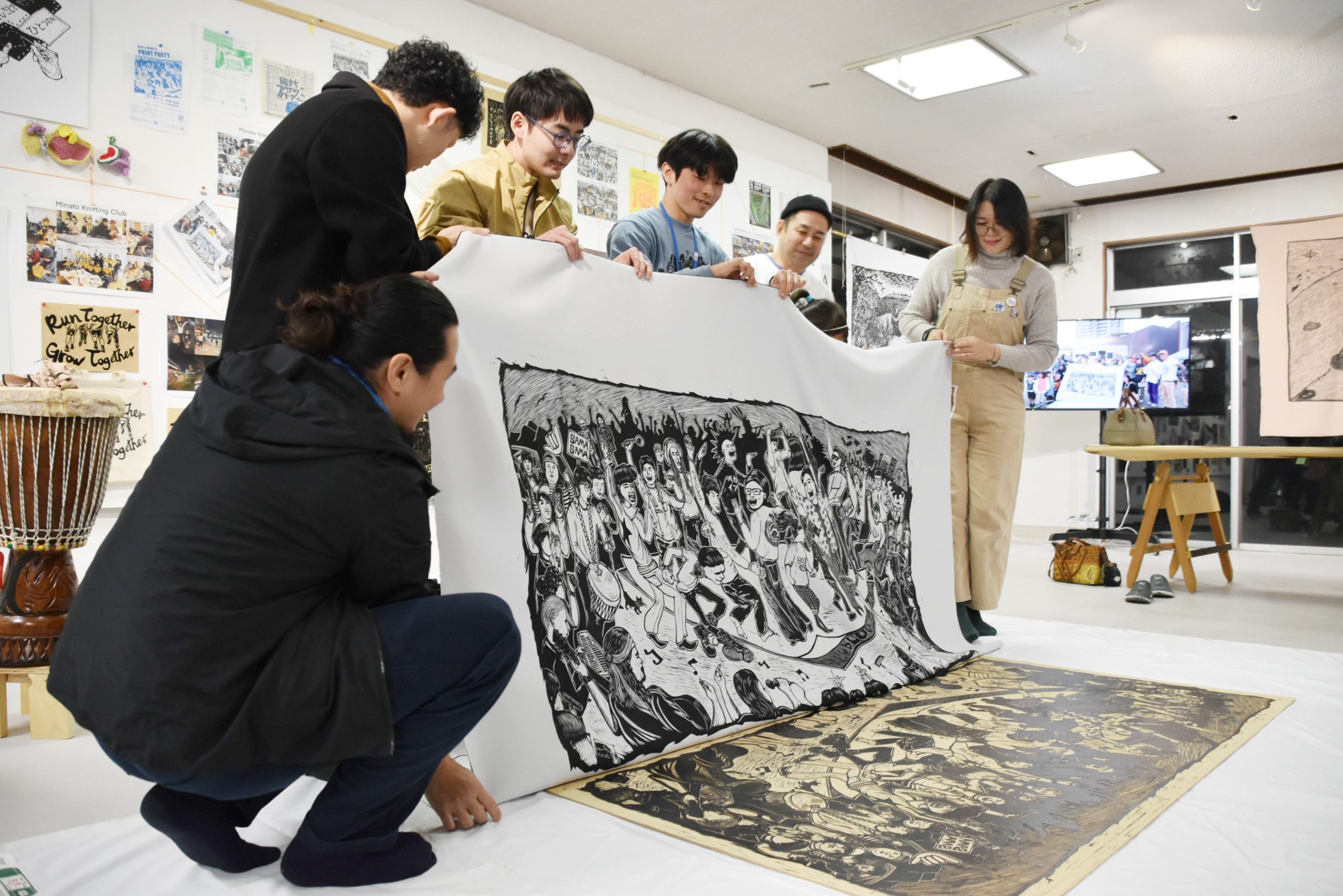 リゾさんとメメットさんが「アッセンブリッジ・スタジオ」のアーティストとともに大型の木版画をライブ演奏に合わせて足でプリントするパフォーマンスを行います。