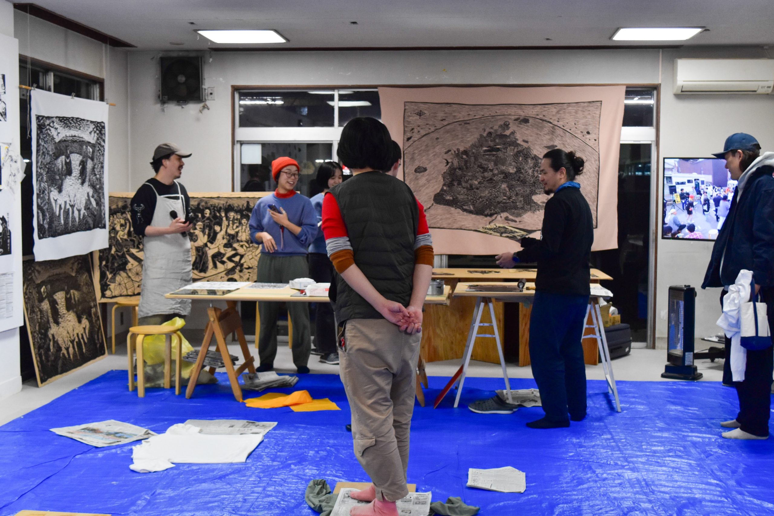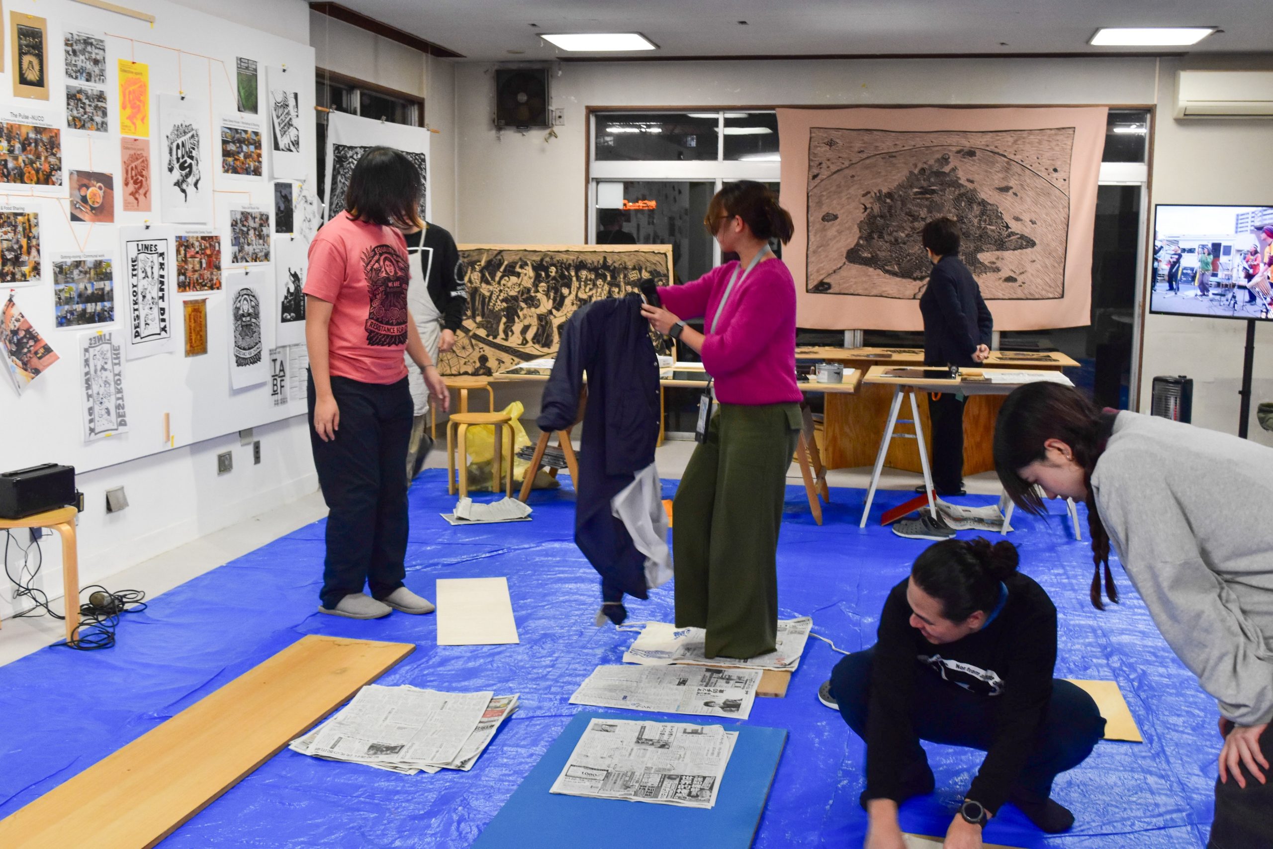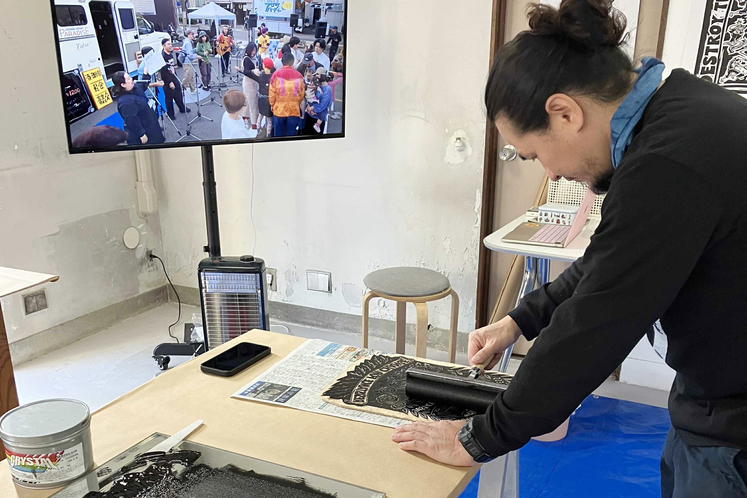 「港まちAIRエクスチェンジ2025」参加アーティストのリゾ・レオンさん、メメット・ジェックさんの木版画をフットプリント(足踏み版画)の技法でプリントします。音楽に合わせて歌ったり踊ったりしながら、一緒に版画をプリントしましょう。