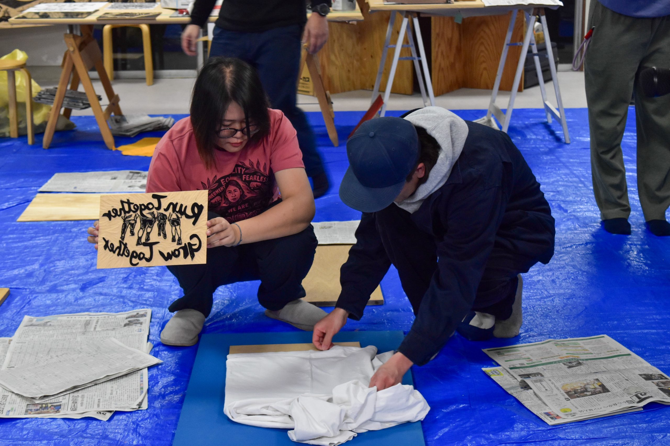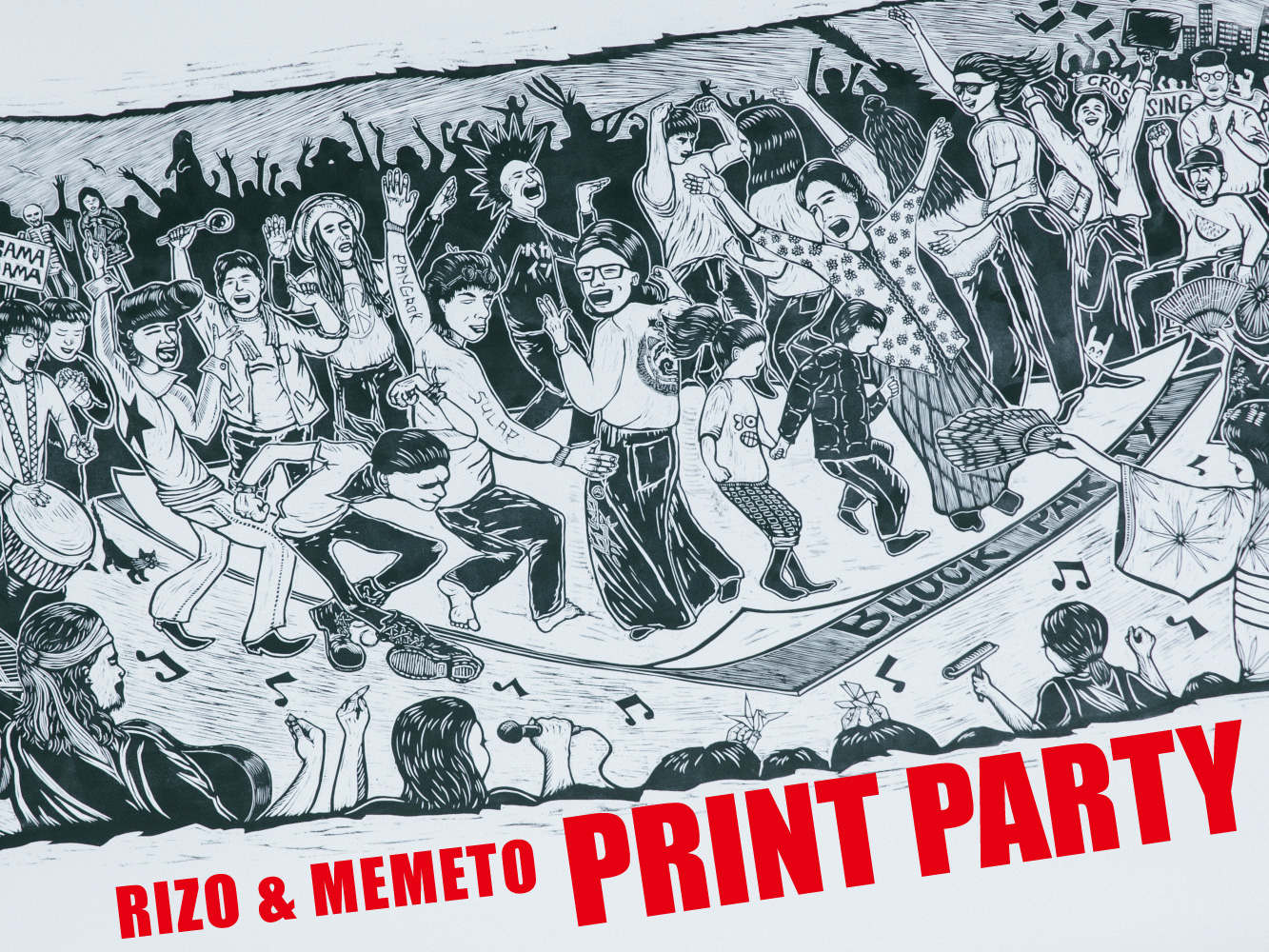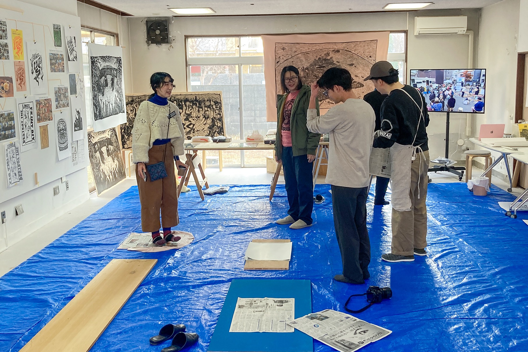 「港まちAIRエクスチェンジ2025」参加アーティストのリゾ・レオンさん、メメット・ジェックさんの木版画をフットプリント(足踏み版画)の技法でプリントします。音楽に合わせて歌ったり踊ったりしながら、一緒に版画をプリントしましょう。